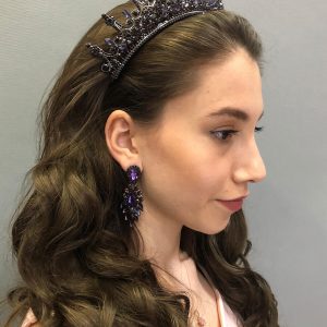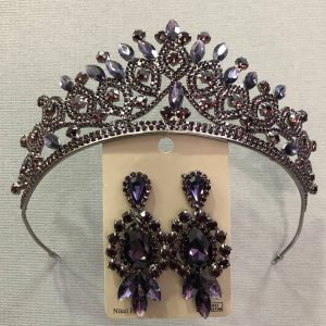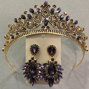 Toptan Mürdüm Kristal Cam Taşlı Altın Rengi Kına Tacı ve Küpe Takımı