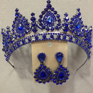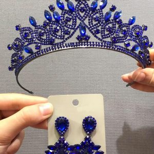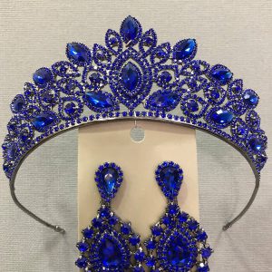 Toptan Lacivert Kristal Cam Taşlı Gümüş Rengi Gelin Tacı ve Küpe Takımı