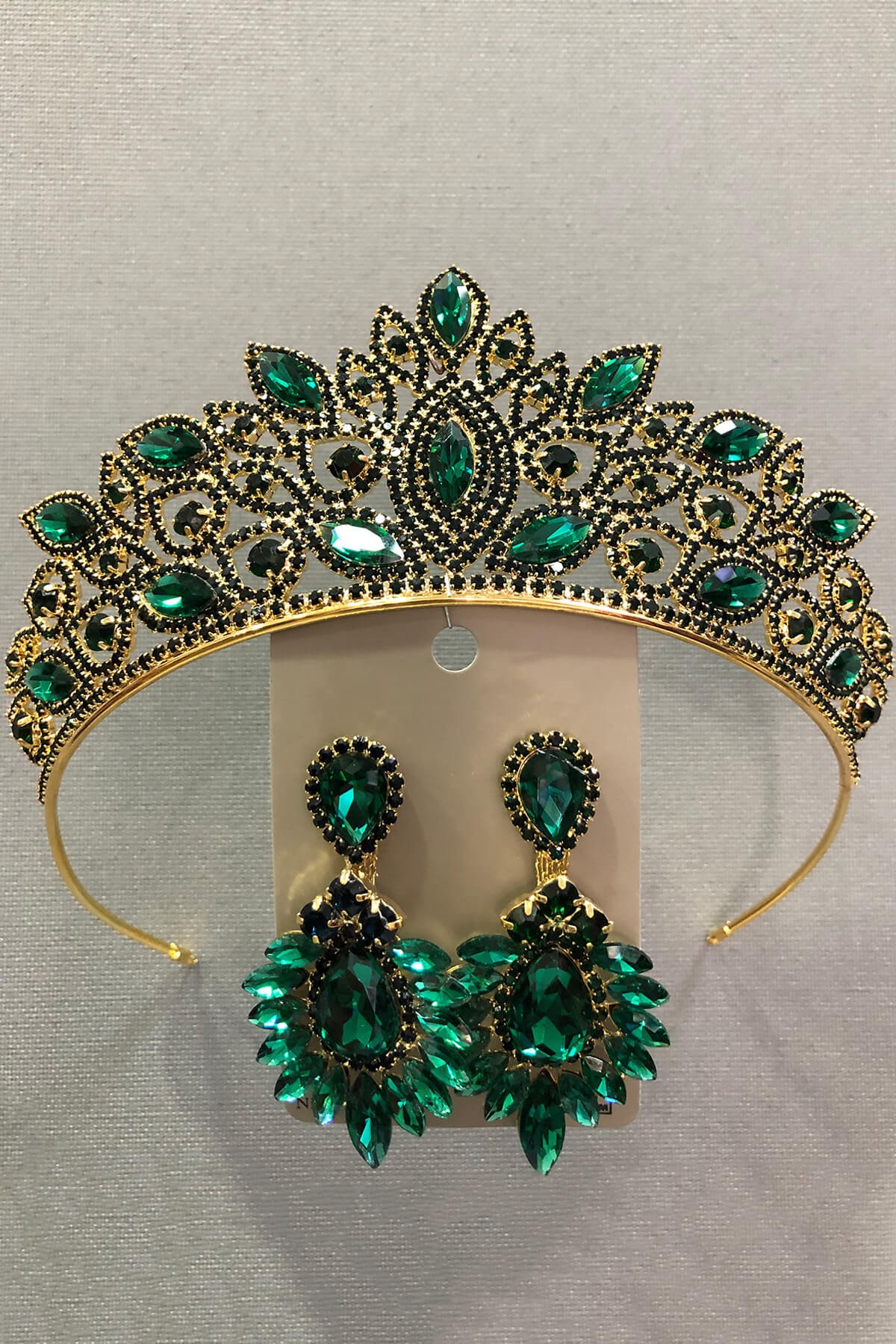 Toptan Zümrüt Yeşili Kristal Cam Taşlı Altın Rengi Gelin Tacı ve Küpe Takımı
